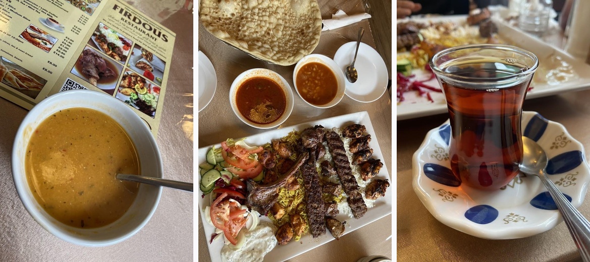 Would 100% recommend a visit to Firdous. My brother in law has been 3x in as many weeks and told me I needed to visit! My friend and I were greeted with some free delicious hot lentil soup and the guys were so welcoming and helped us choose off the menu. We chose the grilled sharing platter for two with freshly baked naan and salad but they also brought us two stews (white bean and okra) to try for free. All was delicious! Afterwards we were given free hot chai tea and some free freshly baked bread for breakfast! The baklava looked delicious but I couldn’t fit it in! All for £30! I’ll be back. Thanks 😊